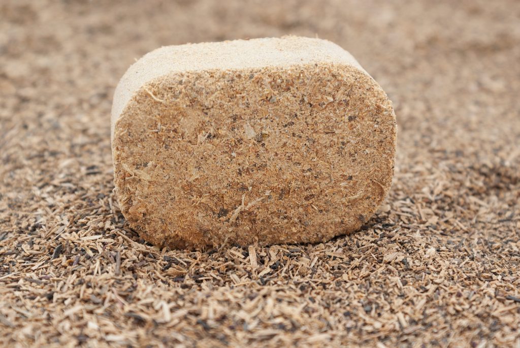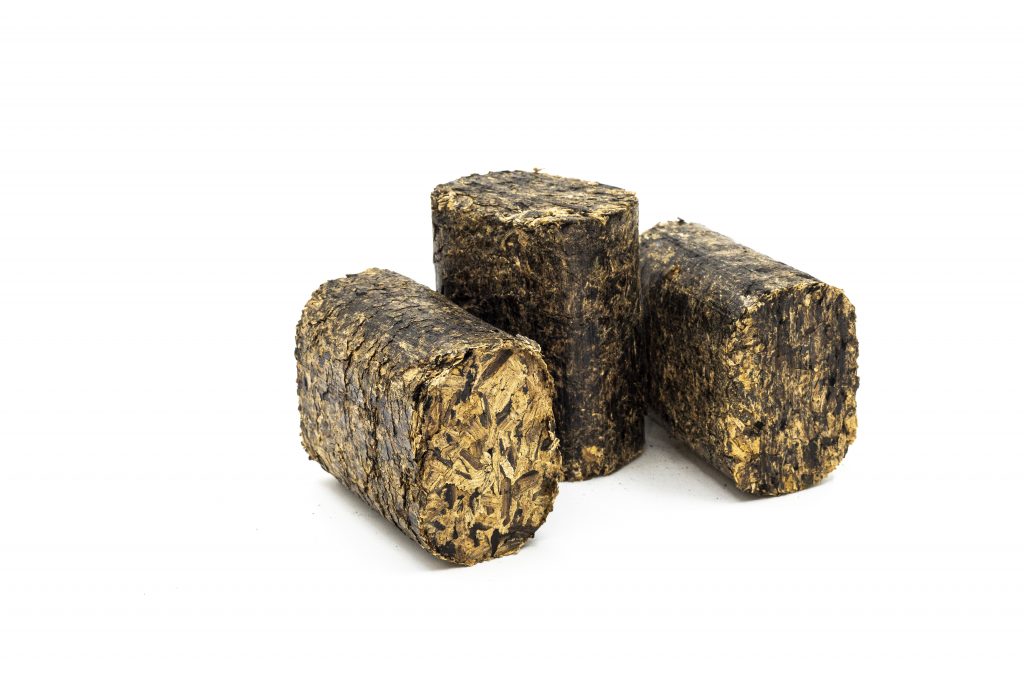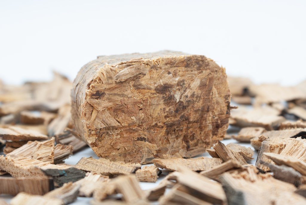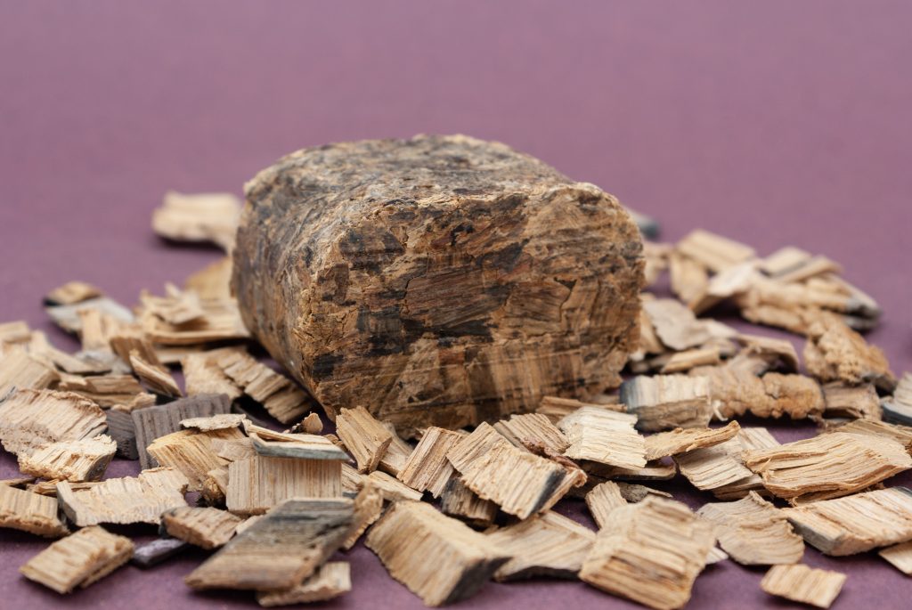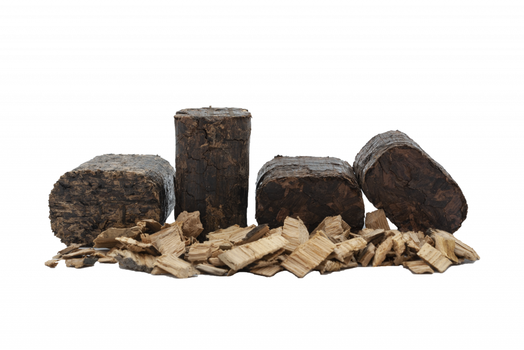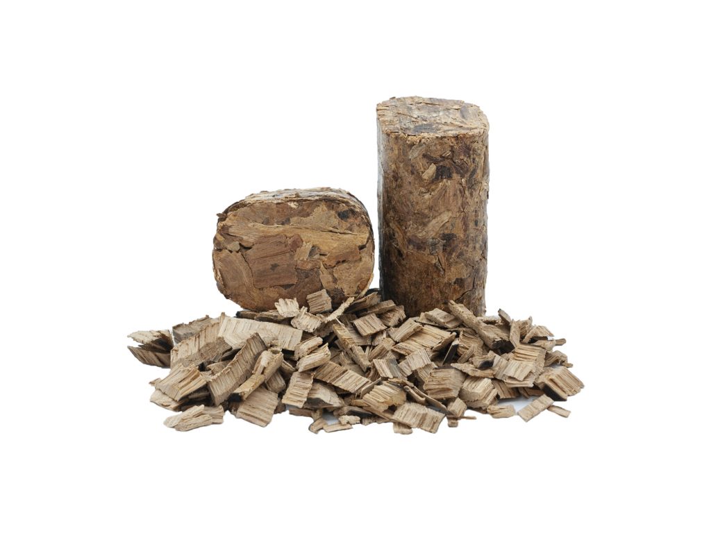 Bloques compactados de virutas, serrín y polvo de roble (americano, francés, europeo). Producto patentado.