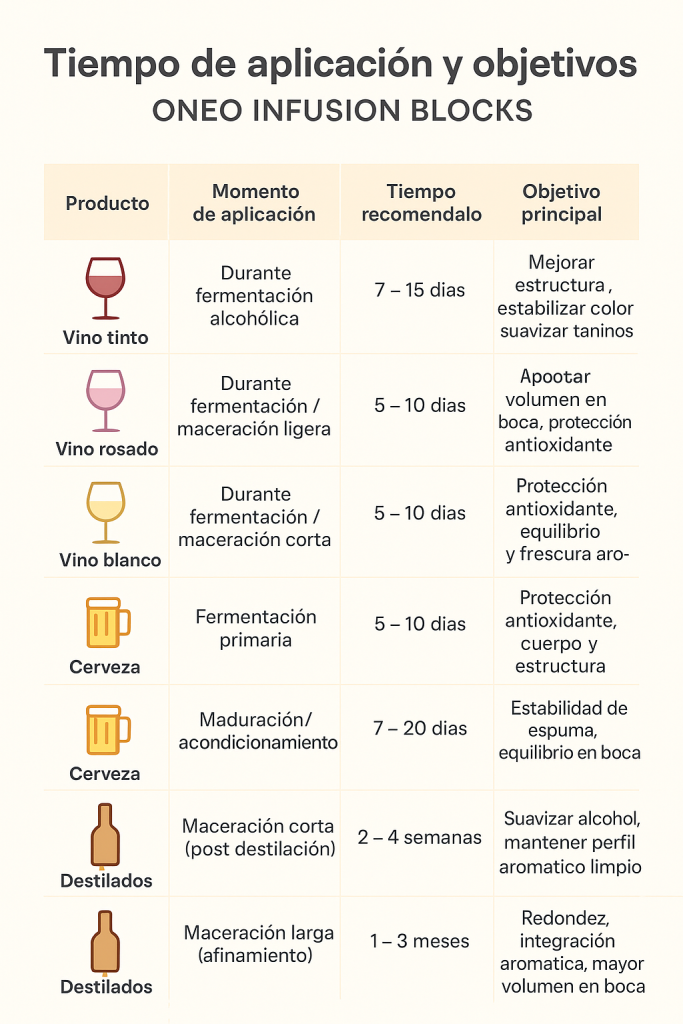 Estas ONEO INFUSION BLOCKS (chips, serrín y polvo) compactados se utilizan como alternativa económica y rápida al almacenamiento en barrica tradicional, cubas grande o recipientes de inox para vino, cervezas y destilados, aportando complejidad aromática y de sabor de manera controlada y reproducible.